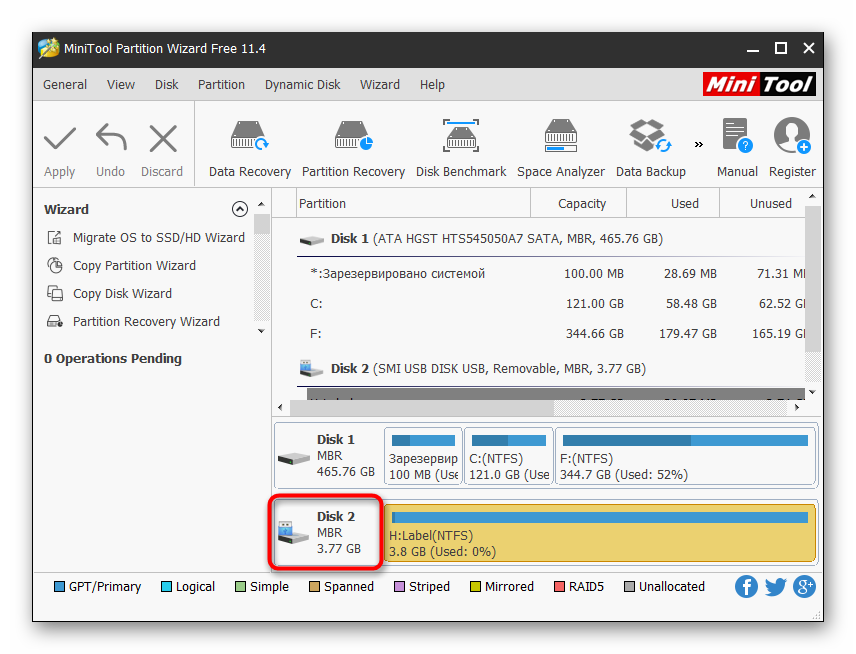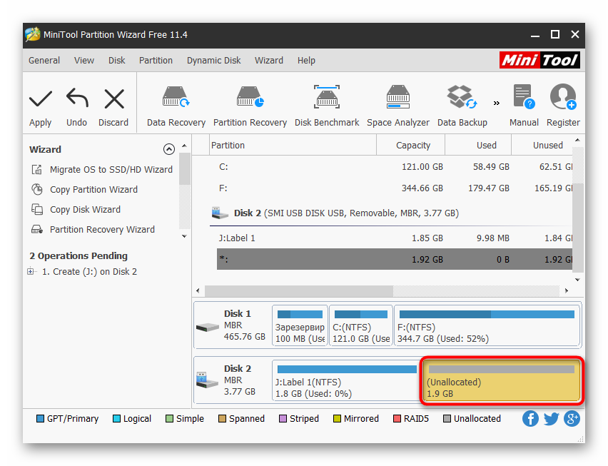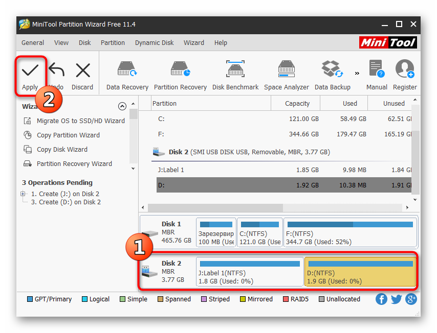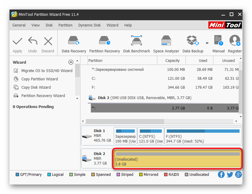 Если предыдущий метод вас по каким-либо причинам не устраивает, советуем ознакомиться с другим подобным обеспечением, которое имеет название MiniTool Partition Wizard. Это решение позволит быстро разбить USB-накопитель на необходимое количество разделов, однако прежде потребуется стереть все данные.