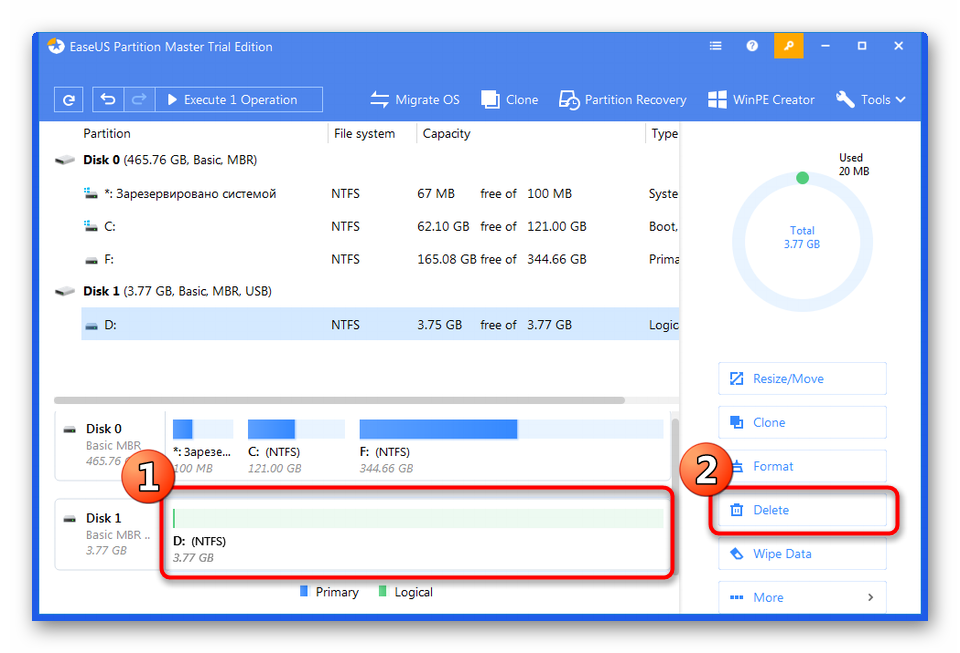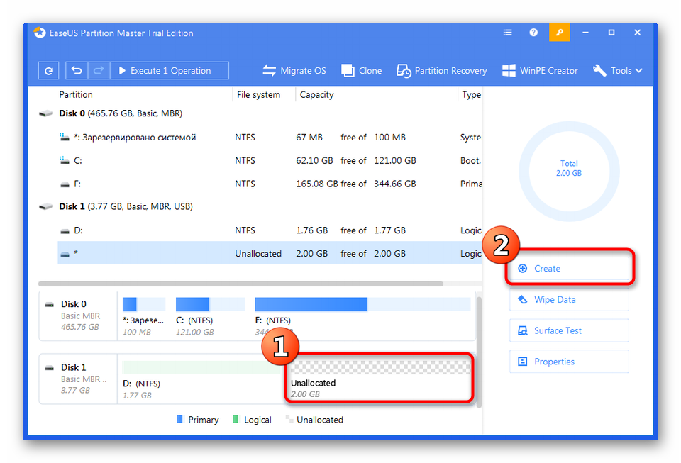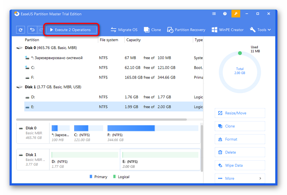 EaseUS Partition Master практически не отличается от рассмотренных выше способов, однако здесь присутствуют дополнительные инструменты, которые могут пригодиться юзеру во время осуществления других действий с накопителями. Хоть программа и является платной (бесплатная версия только демонстрирует работу функций), мы все же решили детально рассказать о создании нескольких разделов флешки.