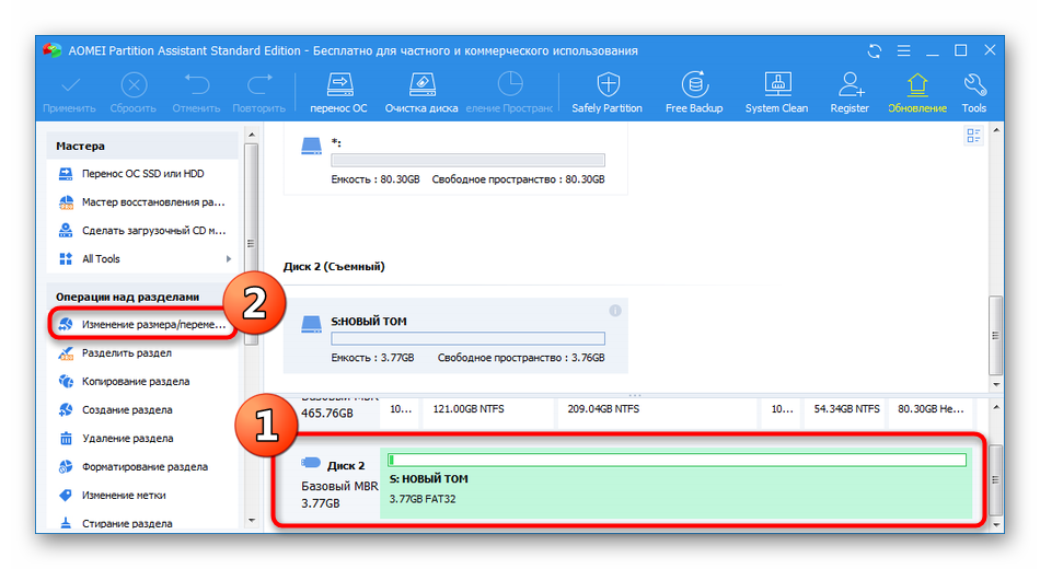 - Загрузите и установите упомянутую программу на ПК. Отметьте раздел флешки и выберите операцию «Изменение размера».