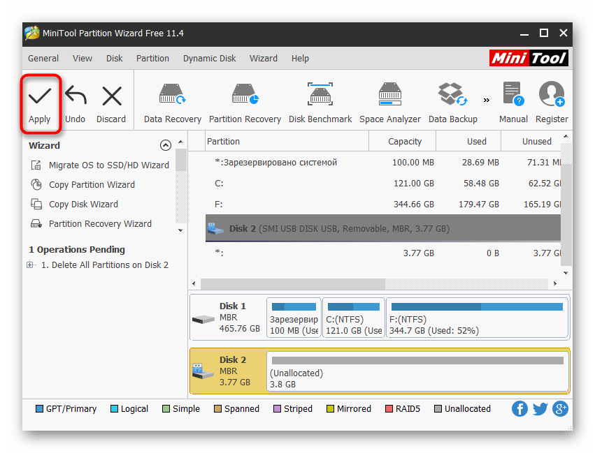 Затем потребуется применить эту операцию, нажав на «Apply».