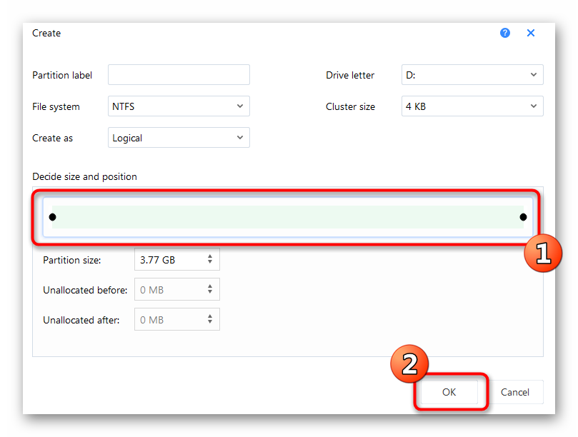 Задайте файловую систему, название раздела, его букву и размер, регулируя ползунок. Затем нажмите на «ОК».