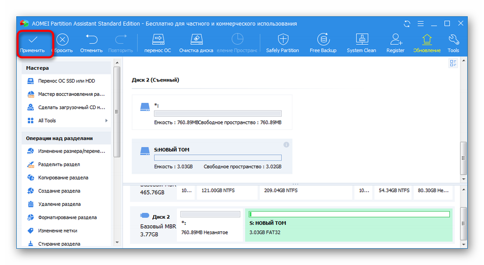 - После создания разделов на накопителе первым способом, первый раздел на нем может быть отформатирован в FAT32 стандартными средствами системы.