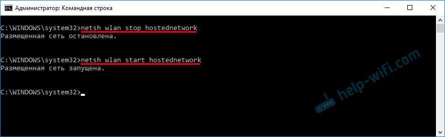 - netsh wlan start hostednetwork — запускается Вай-Фай (при открытом доступе к интернет-соединению он становится доступным для остальных девайсов);