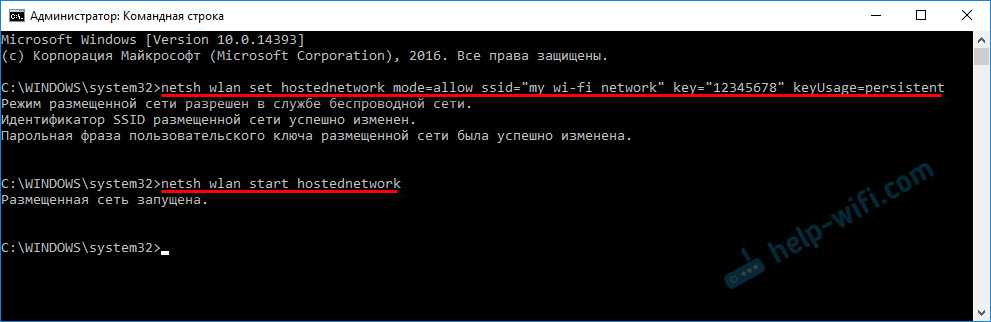 - netsh wlan set hostednetwork mode=allow ssid=okwifi. com key=okwificom keyUsage=persistent — сменяется имя сети и/или пароль.