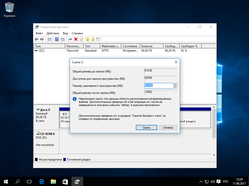 Доступное для сжатия пространство — сколько максимально можно от него отрезать (мы не рекомендуем отрезать максимум, особенного с системного диска!!!)