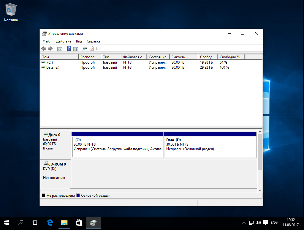 После выполнения процедуры в консоли «Управление дисками» мы видим, что у нас проявился второй простой том с буквой диска E и меткой Data, которые мы задали в настройках создания раздела.