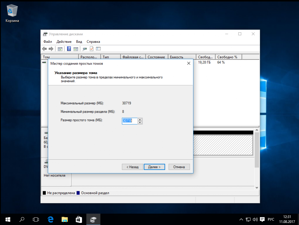 В данном окне мы выбираем, какого размера мы хотим создать том. Мы можем использовать весь объем свободной области, или, например, создать 2 тома по 15ГБ. В нашем случае мы выбираем максимальный размер и нажимаем «Далее»