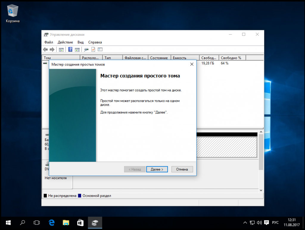 Нам откроется «Мастер создания простого тома«. Нажимаем «Далее»