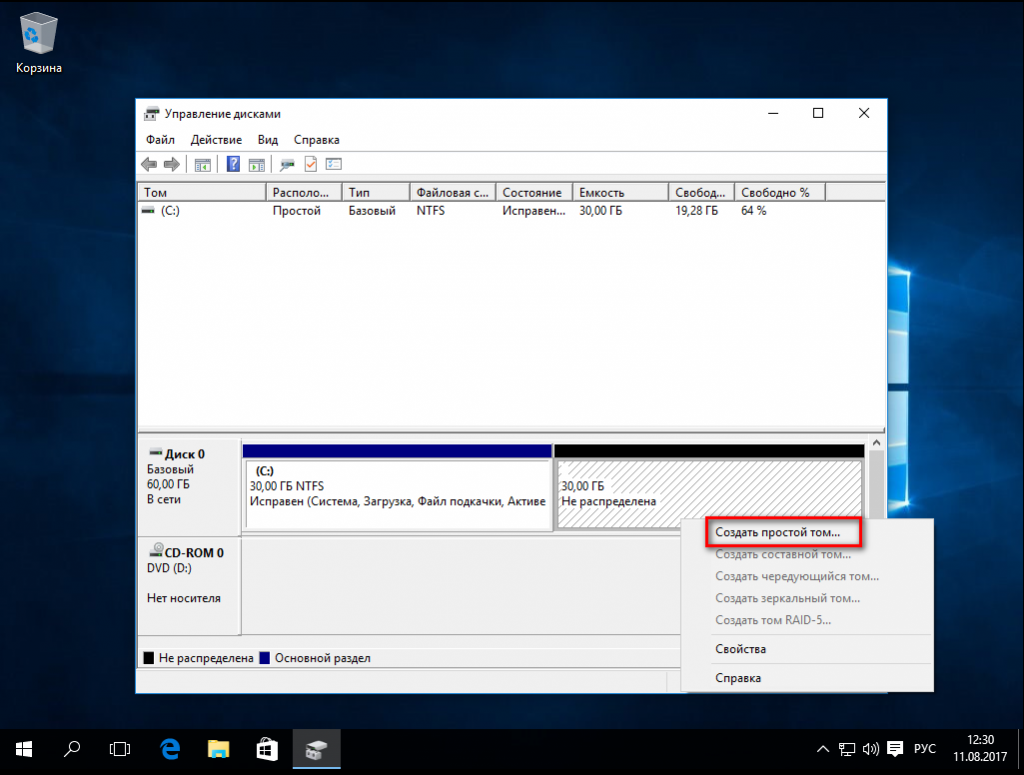 Теперь нам нужно создать дополнительные разделы (или один раздел), используя нераспределённое место. Нажимаем правой кнопкой мыши по нераспределённому пространству справа от системного раздела и выбираем в контекстном меню Создать простой том… :