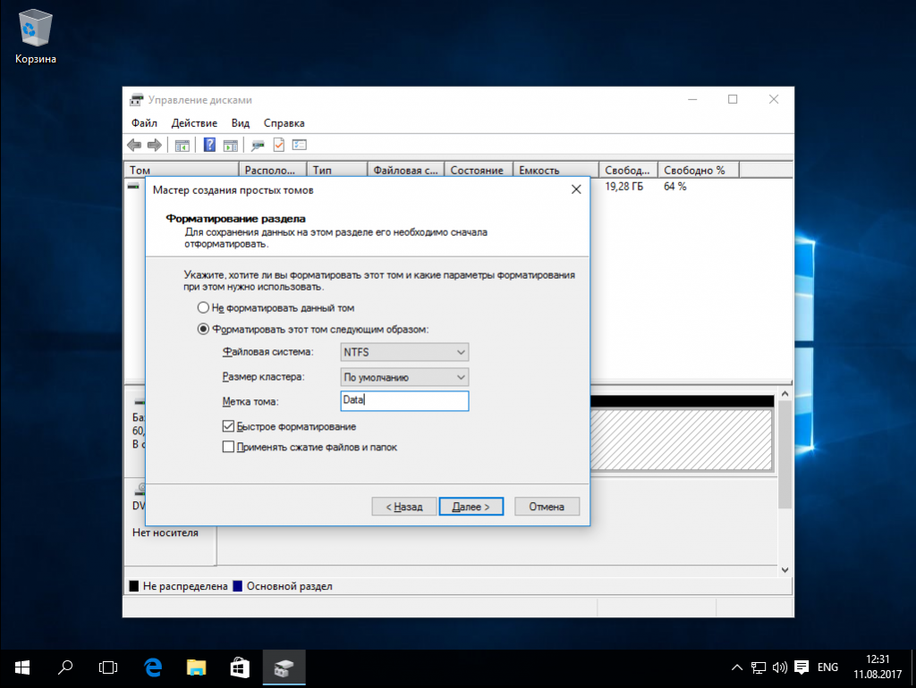 Задаём метку тома для несистемного раздела, отмечаем галку быстрое форматирование и нажимаем Далее :
