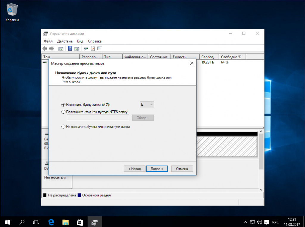 Следующим этапом будет выбор буквы, которую мы назначим нашему новому тому. По умолчанию Windows подставляет ближайшую свободную по алфавиту букву, в данном случае это буква E. Нажимаем «Далее»