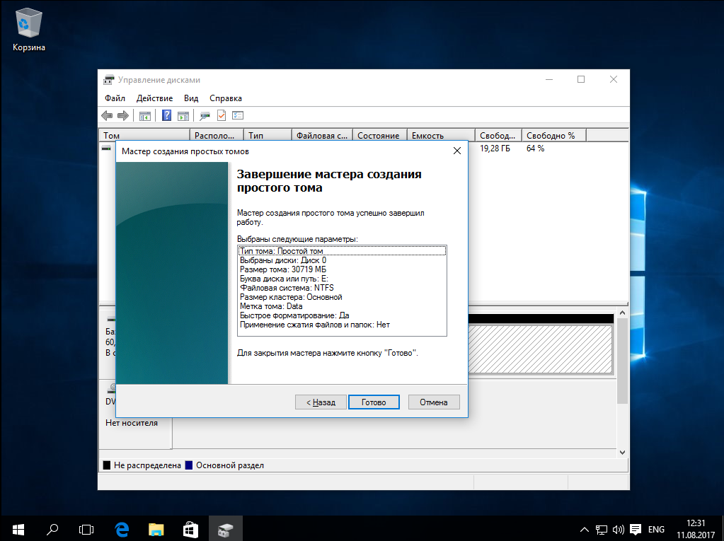 Теперь нам осталось только проверить, все ли мы настроили так, как мы хотели? Если все верно, то нажимаете кнопку «Готово«. После нажатия на готово, операционная система приступит к созданию и форматированию нового раздела. Обычно это занимает несколько секунд.