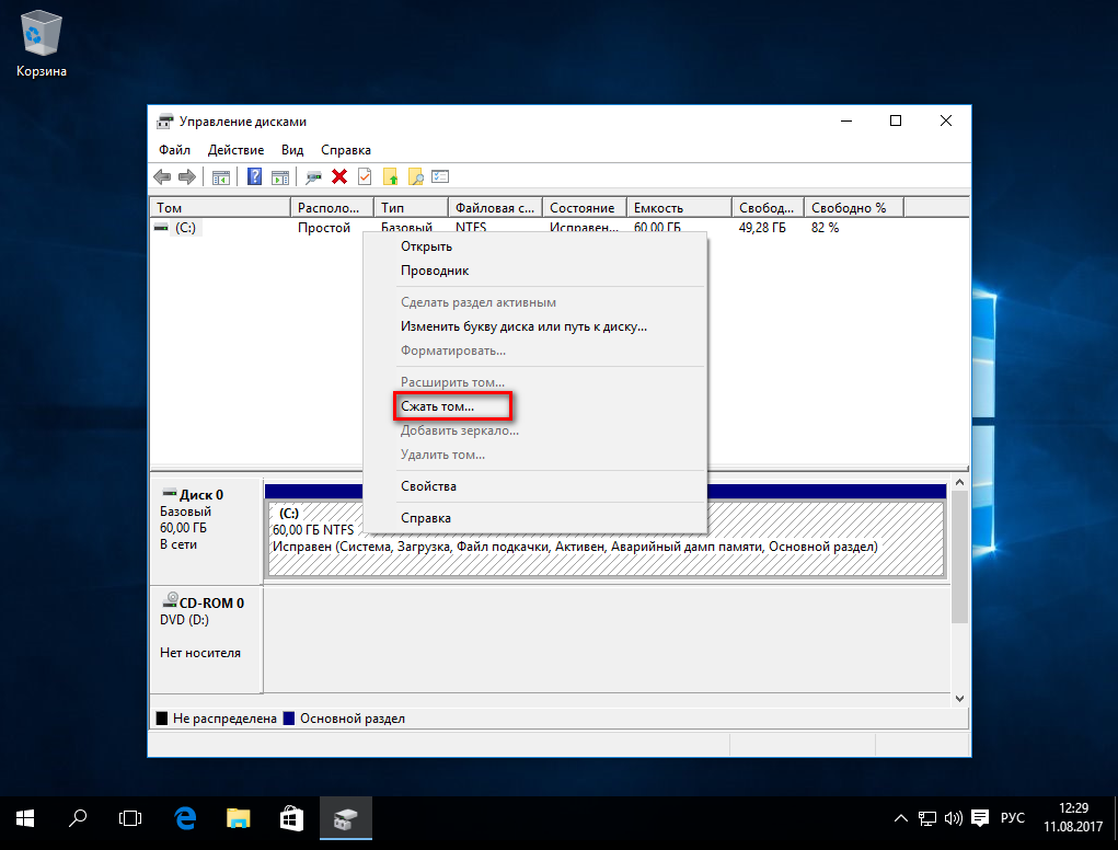 Нажимаем правой кнопкой мыши по системному диску (самый большой) и выбираем пункт Сжать том :