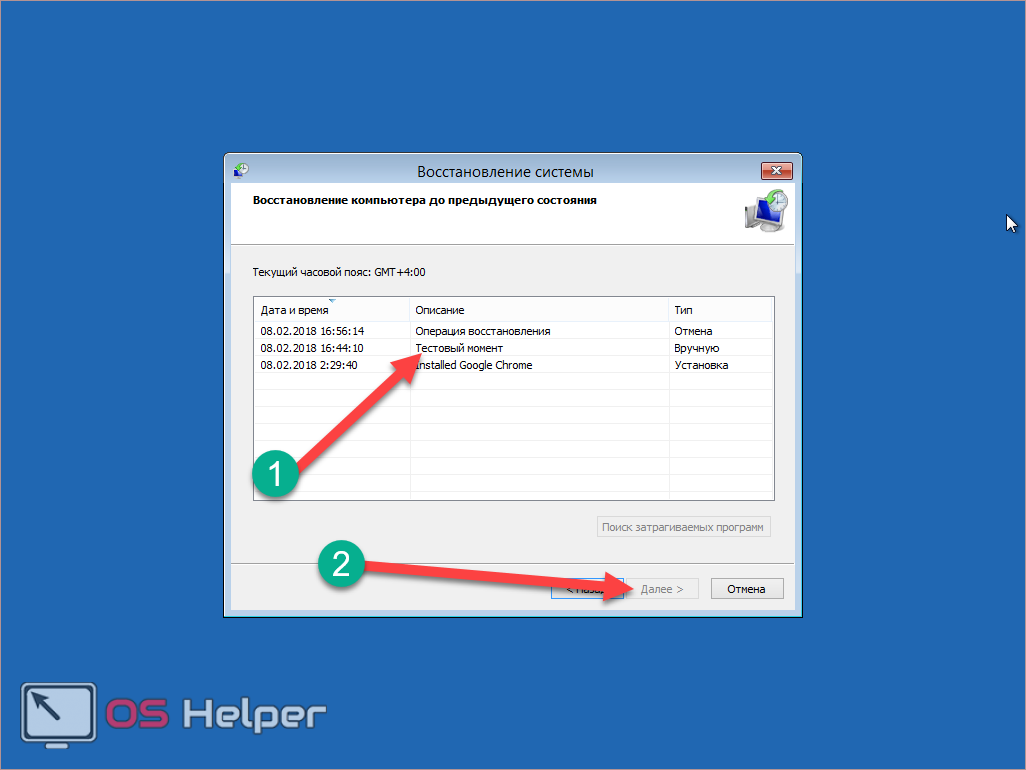 7. Выбрать точку восстановления из списка доступных, нажать «Далее»;