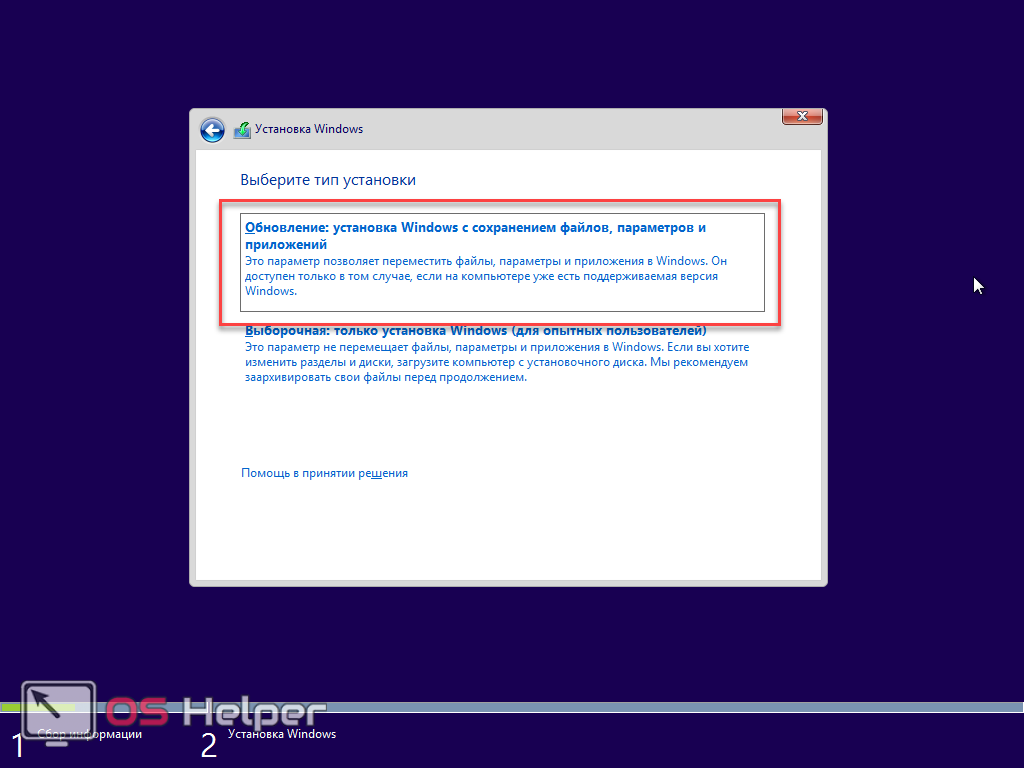 В следующем окне выберите тип установки. Нажмите на «Обновление», так как необходимо заменить операционную систему, а не отформатировать диск. В случае выбора «Полной» установки вы гарантировано потеряете все свои данные, будьте осторожны.