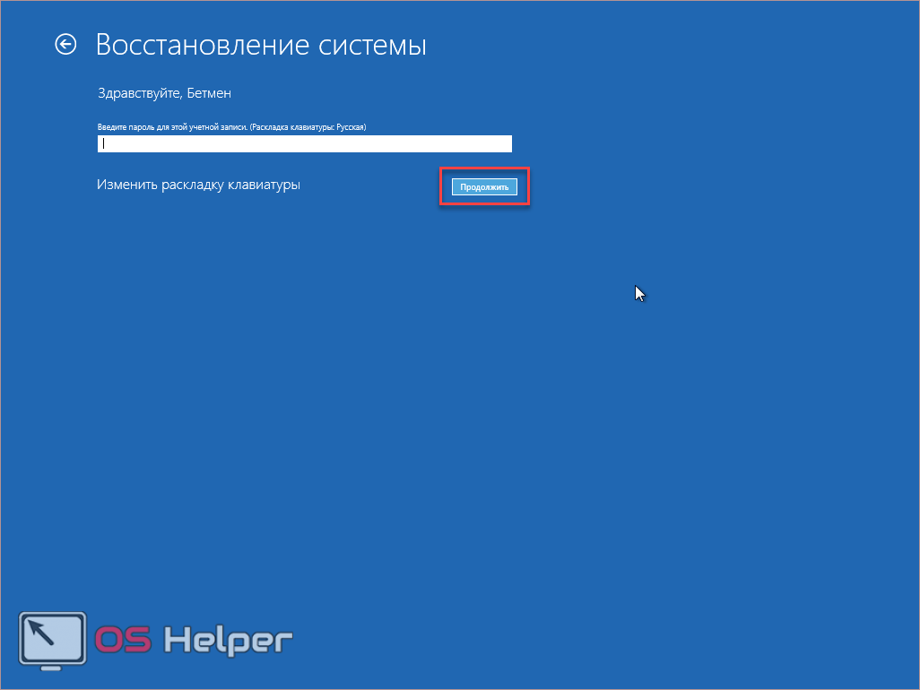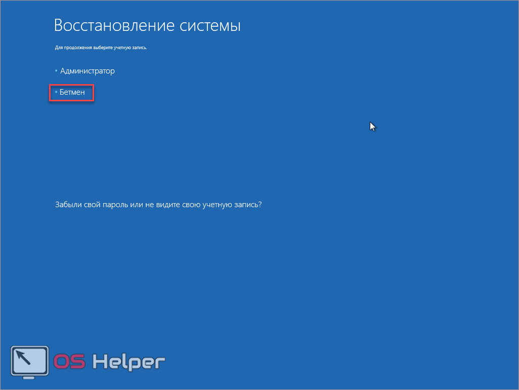 7. В открывшемся меню «Восстановить» выберите свой учетный профиль и пароль, если он есть;