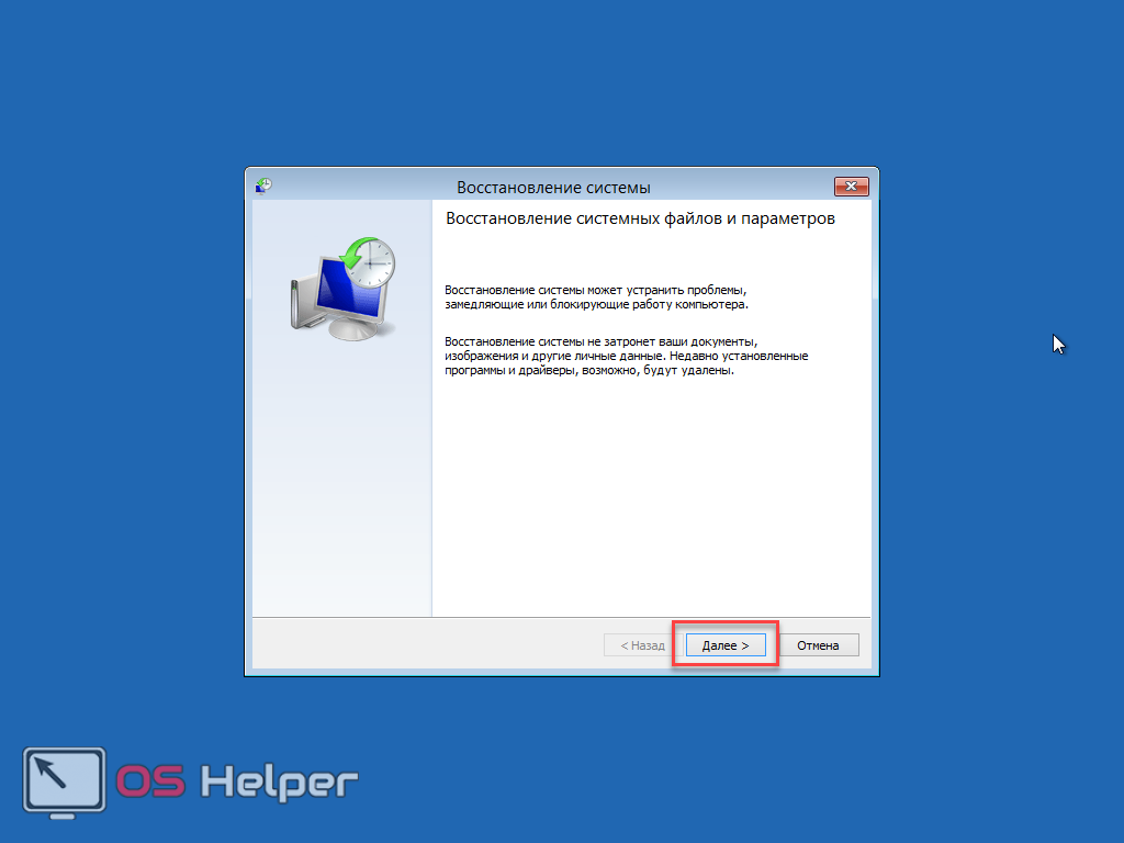 6. Откроется «Восстановление компьютера», нажать кнопку «Далее»;