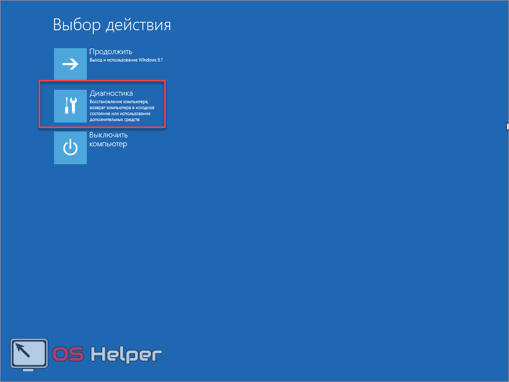 4. Перед Вами откроется системное меню «Выбор действия», в котором следует выбрать «Диагностика»;
