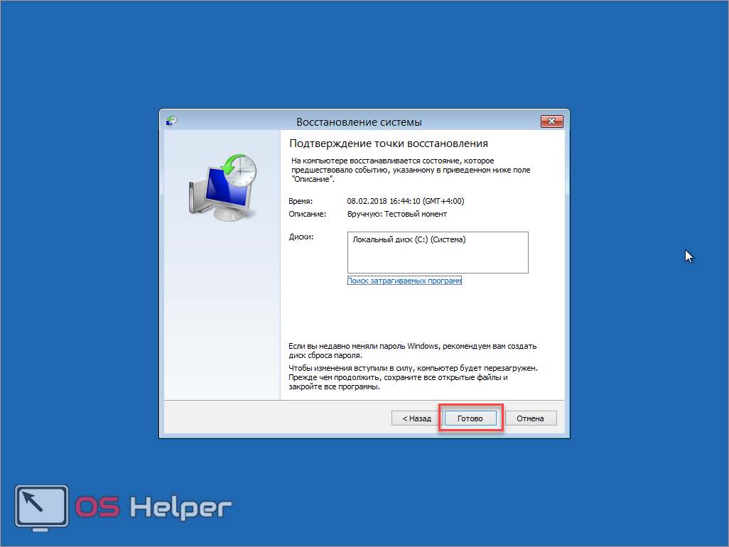 - В конце потребуется перезагрузка компьютера, в результате которой ОС вернется к прежнему состоянию.