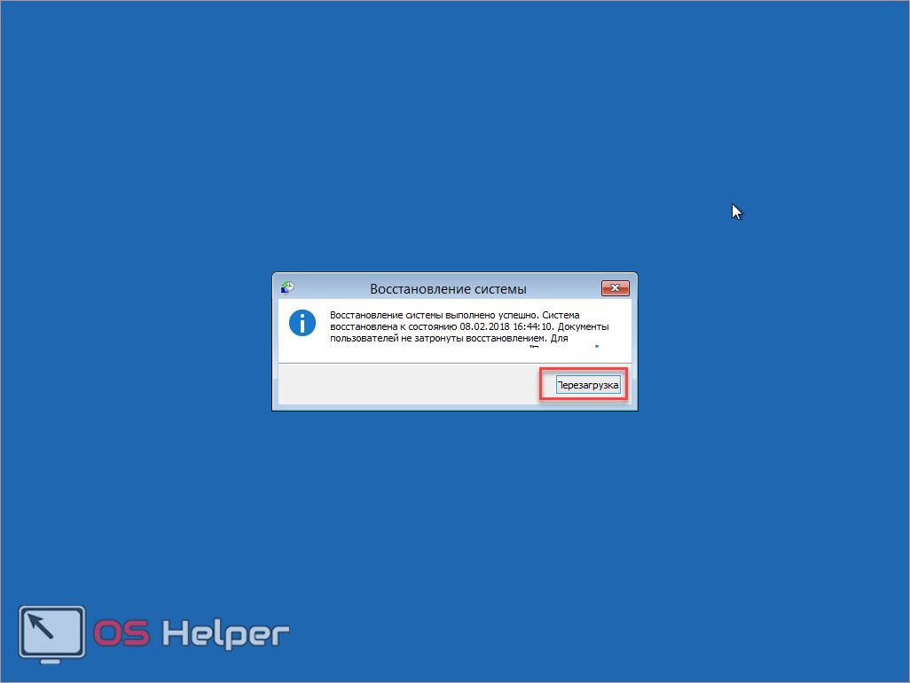 10. Дождаться завершения процесса восстановления, не прерывая его, а также не отключая никаких системных устройств, так как это может привести к отказу восстановления;11. Состояние системы будет восстановлено после финальной автоматической перезагрузки ОС.