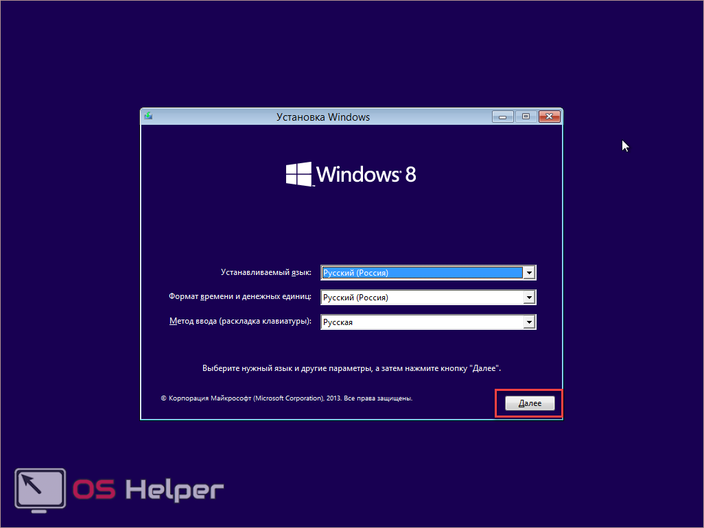 Выберите язык системы и раскладку клавиатуры в начале процесса установки. Выставьте необходимые данные или оставьте те, что даны по умолчанию. Нажмите «Далее».