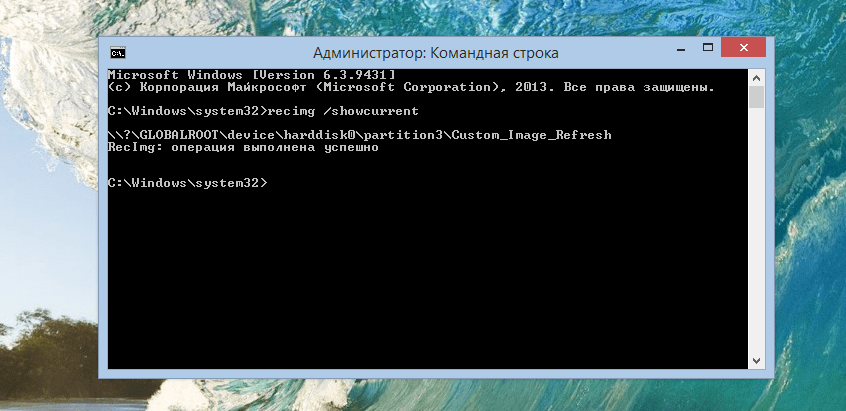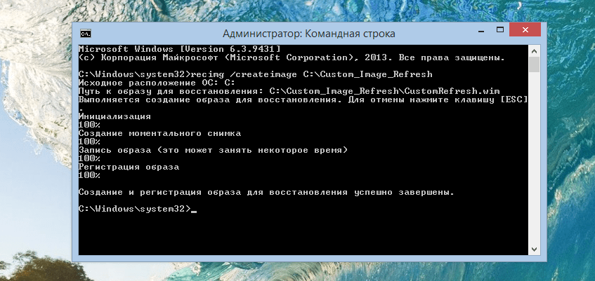 Итак, мы создали пользовательский образ системы Windows 8.1 на диске, на котором установлена операционная система (C:\Custom_Image_Refres). Теперь нужно зарегистрировать образ для того, чтобы операционная система знала о нем, и использовала его при восстановлении. Чтобы сделать это, введите следующую команду в командной строке: