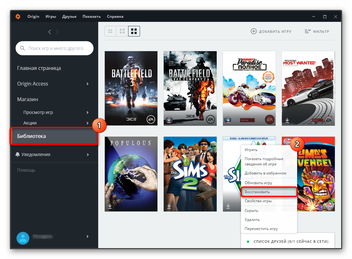 - Откройте «Библиотеку» в окне игрового клиента, найдите игру, щелкните по ней ПКМ и выберите «Восстановить».