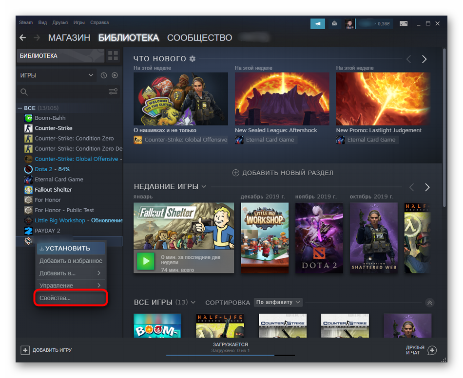 - Разверните окно «Библиотека» игрового клиента и найдите ту игру, которую не получается запустить. Кликните по ней ПКМ и зайдите в «Свойства».