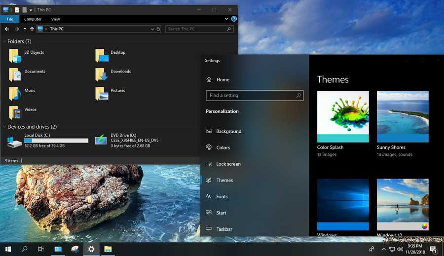 Из системы удалены Microsoft Store, Cortana, браузер Edge, панель Ink Workspace, Game Mode, OneDrive. Также в ней нет всего того комплекта UWP-приложений, которые поставляются в обычных редакциях Win10. По части персонализации LTSC ничем не отличается от обычных редакций, в ней можно использовать любые обои, любые темы оформления, включая тёмную, действие которой в Win10 1809 расширилось и на системный проводник.