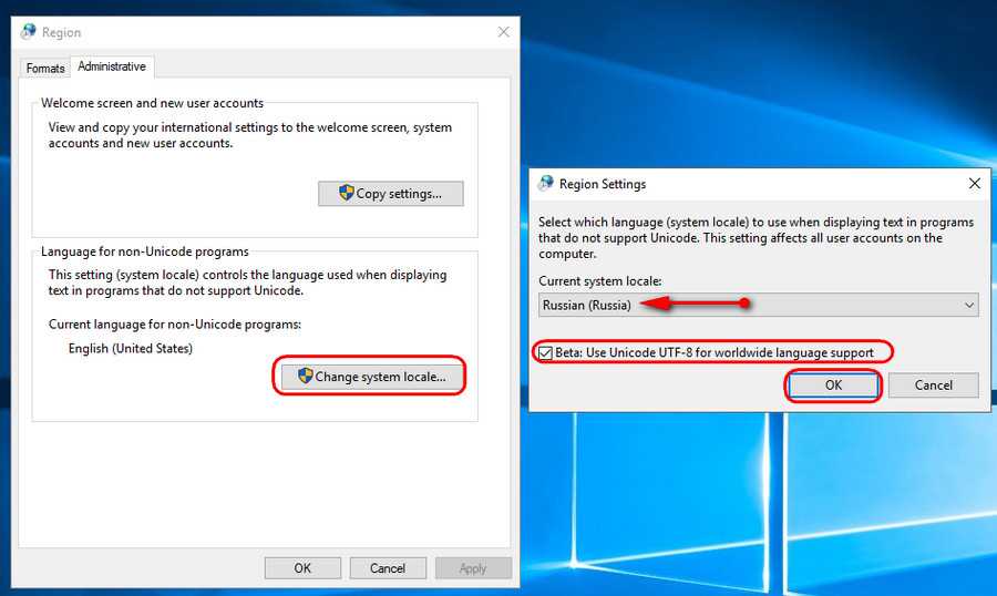 Жмём «Change system locale», выставляем «Russian», ставим галочку использования UTF-8. Кликаем «Ок».