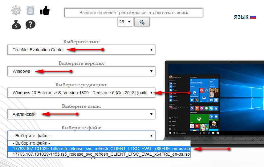 Заполняем вопросник Microsoft, указываем нужную разрядность, язык (русского дистрибутива, кстати, нет) и скачиваем.