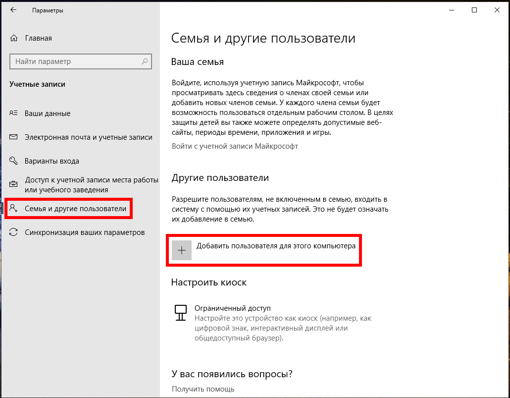 На странице «Учетные записи» перейдите на вкладку «Семья и другие пользователи», а затем нажмите кнопку «Добавить пользователя для этого компьютера». Вас может соблазнить кнопка «Добавить члена семьи», но эта функция требует настройки учётной записи Microsoft в Интернете и назначения членов вашей семье. Это полезная функция, которая позволяет вам контролировать учётную запись ребёнка, но это не то, что нужно нам в данный момент.