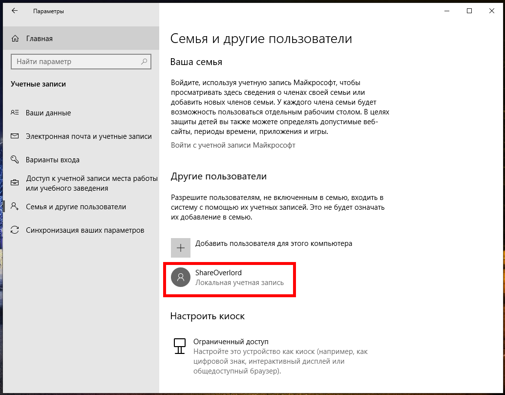 Создание новой учётной записи локального пользователя в Windows 10