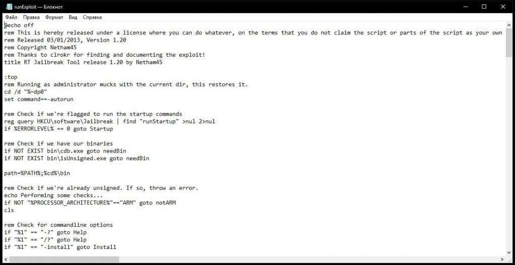 Выход был найден и представлен группой энтузиастов в виде небольшой утилиты RT_Jailbreak 1.20, которая содержит «батник», позволяющий отключить проверку цифровых подписей устанавливаемых приложений (без подписи Microsoft инсталляция оказывается невозможной, равно как и отключение проверок средствами самой системы, в которой такие средства заблокированы).