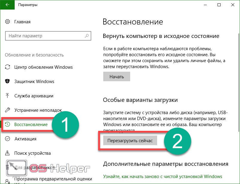 Для этого откройте меню Пуск, кликните на значок шестеренки (Параметры), перейдите на вкладку «Обновление и безопасность» — «Восстановление». Найдите пункт «Расширенный запуск» и кликните на кнопку «Запустить сейчас».
