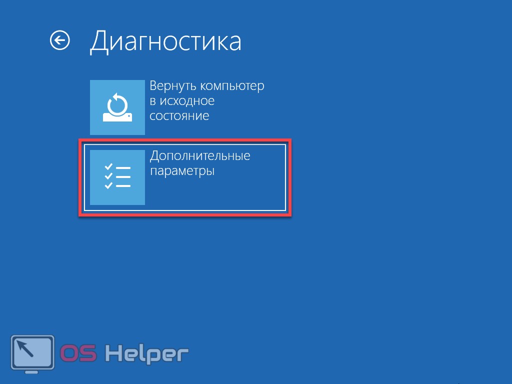 Кликните на «Восстановление системы», выберите раздел «Диагностика» и в Дополнительных параметрах выберите первый пункт, как показано на рисунке.