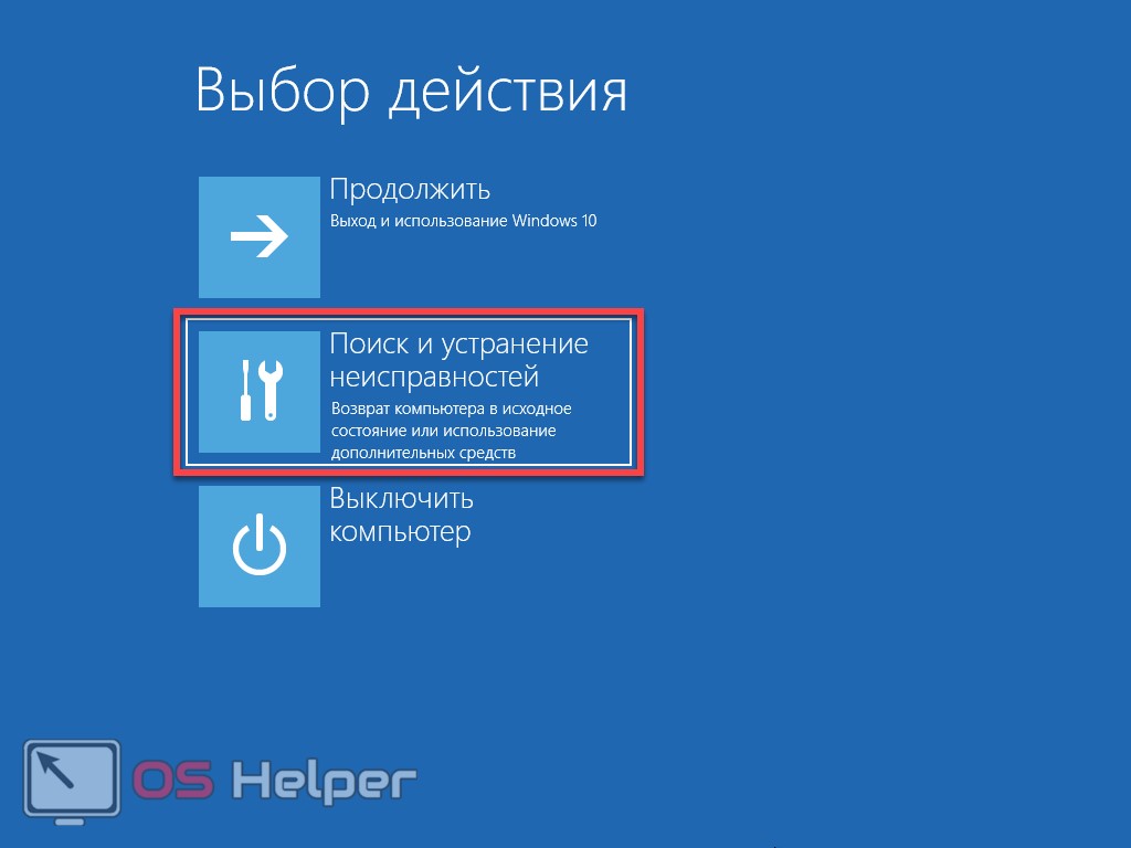 - Компьютер перезагрузится. На открывшемся экране выберите пункт «Поиск и устранение неисправностей».