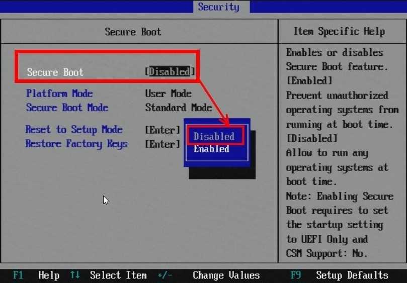 - В появившемся окне перейдите во вкладку «Boot» и в категории «Secure Boot» выставите значение «Disable».