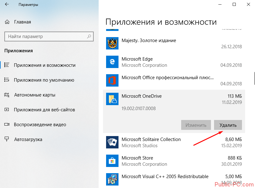 В первой же вкладке находим приложение Microsoft OneDrive и кликаем удалить.
