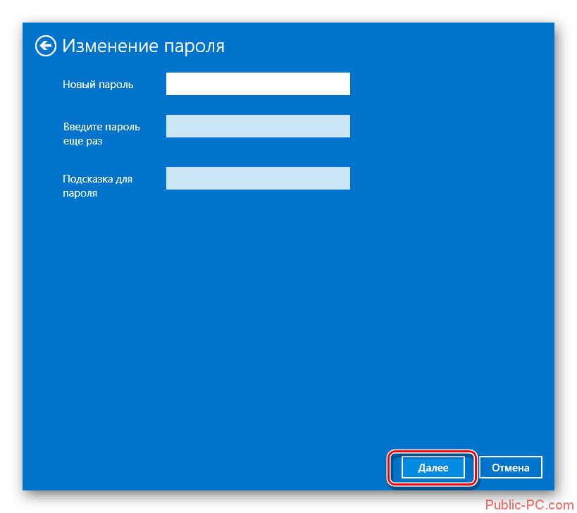 Теперь вам предложено ввести новый пароль. Так как вам нужно вообще снять пароль с компьютера, то просто оставьте поля пустыми и нажмите кнопку «Далее».