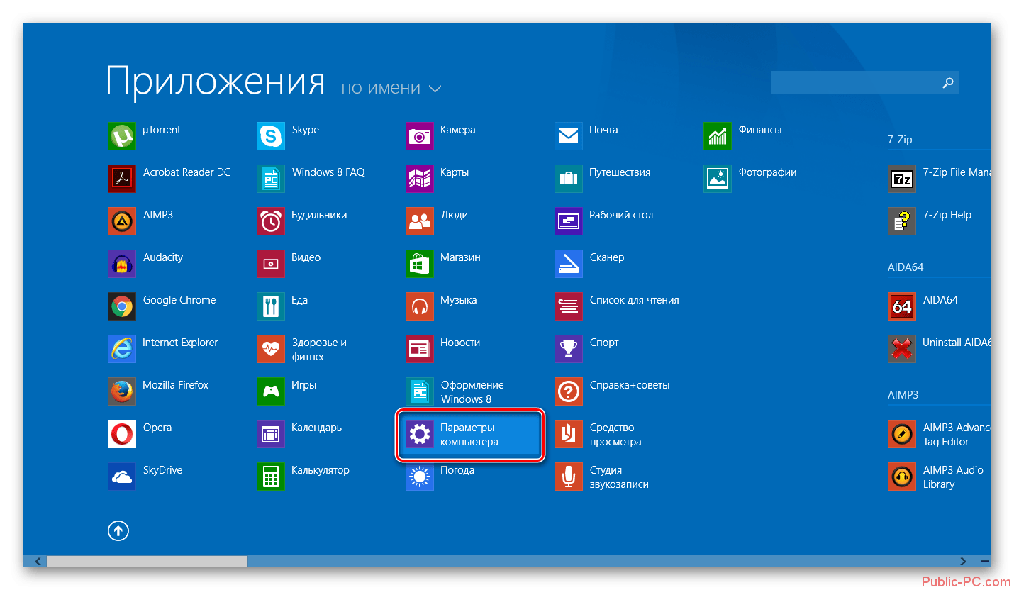 - Откройте «Параметры компьютера». Вы можете найти нужный элемент через список приложений, а также системный поиск Charms.