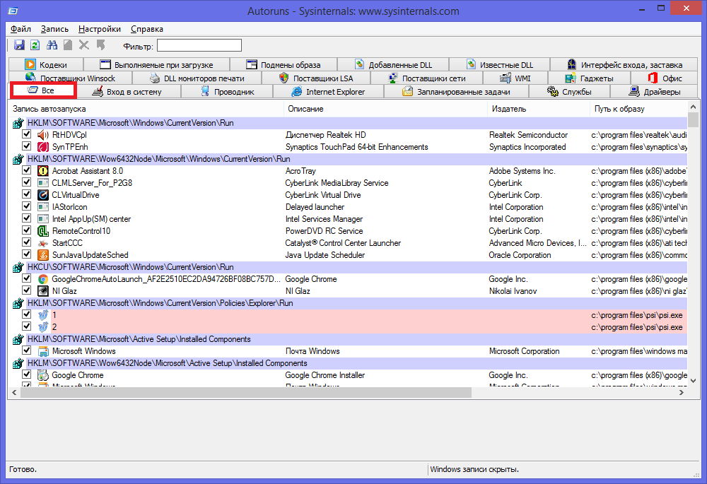 «Все» или «Everything» — нужная вкладка, на которой можно увидеть списки абсолютно всех программ, служб, драйверов и так далее, которые включаются во время запуска системы. Остальные вкладки позволяют увидеть то же самое, но в упорядоченном и фильтрованном виде. Отключить автозагрузку программ можно из любой вкладки.