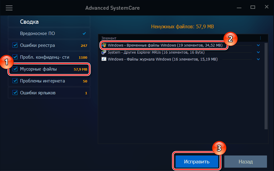 Advanced Systemcare — программа, которая по простоте использования и функционалу ничем не уступает CCleaner. С ее помощью также можно избавится от временных данных. Для этого всего лишь нужно выполнить такие команды.