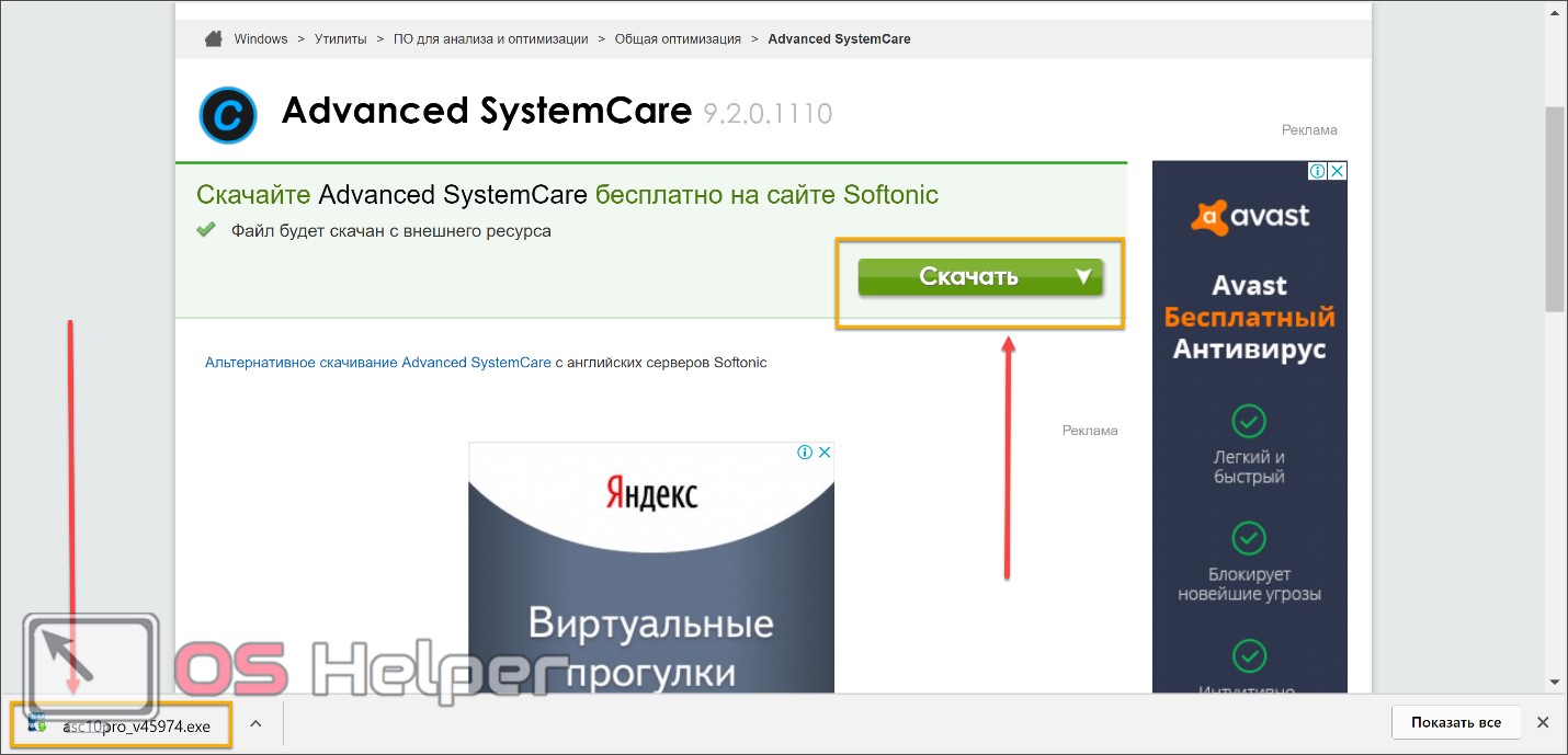 - После того как программа скачается, запускаете инсталлятор и ждете, пока приложение установится. Когда все будет готово, Advanced SystemCare автоматически запустится и начнет сканировать систему.