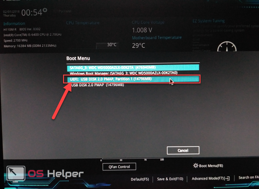 Примечание: флешка должна быть вставлена в USB-порт еще до включения лэптопа. Если загрузка с нее не стартует, и у вас на ноутбуке в качестве первичной системы используется не BIOS, а обновленная оболочка UEFI, флешка может отображаться в виде двух устройств, одно из которых может иметь метку «EFI». В этом случае выбирать нужно именно его.