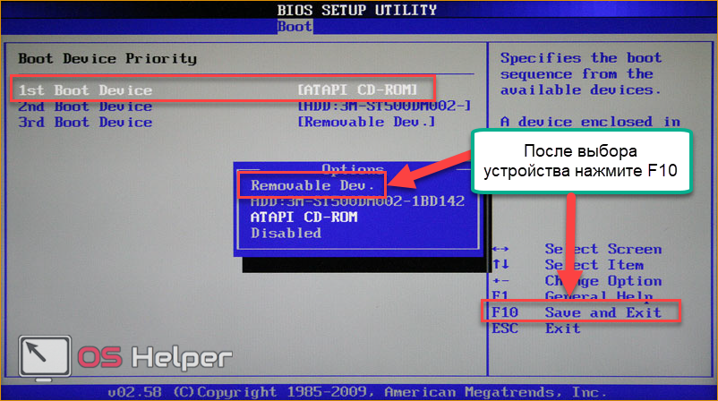 В качестве первого устройства должна стоять USB-флешка. Если она уже вставлена в компьютер, то ее названием может быть производитель, например, Transcend 8 GB или что-то подобное. Если такой пункт отсутствует, то выставьте USB-drive.