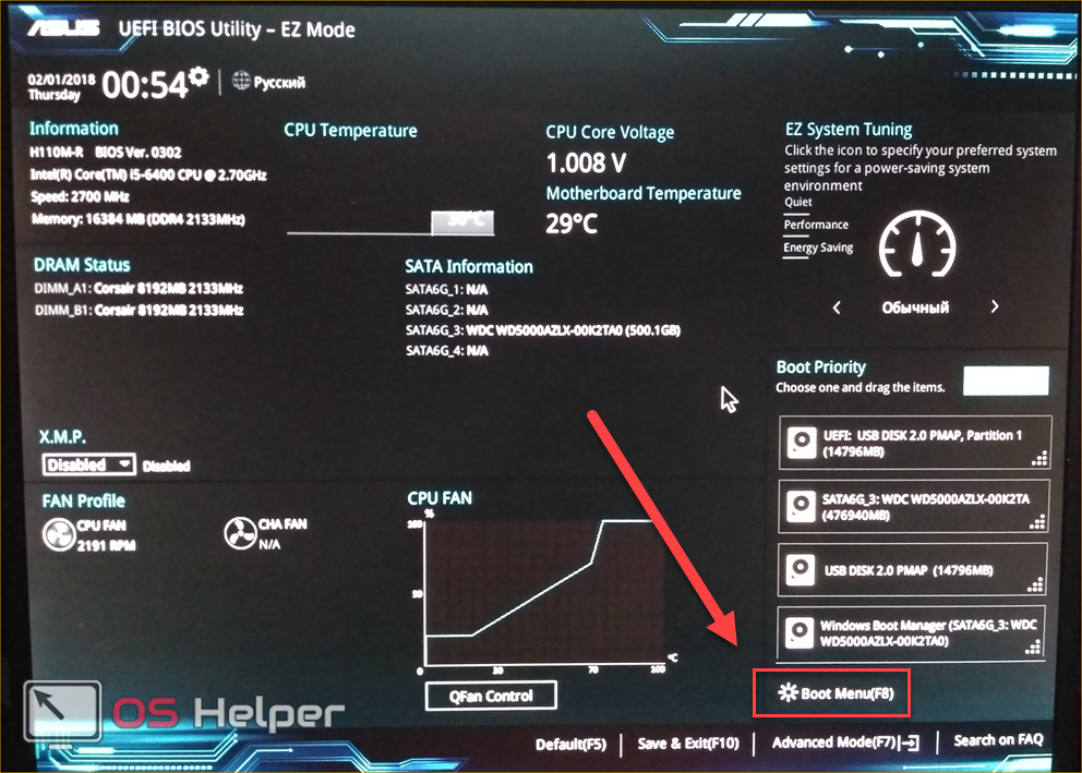 Если вы не знаете, какую из них необходимо нажимать, внимательно посмотрите в нижнюю часть экрана во время запуска компьютера. После того, как вы войдете в BIOS, необходимо указать порядок загрузки (найдите данную опцию во вкладках Boot Order, Boot и т. д.). Чтобы компьютер загружался с флешки или DVD-диска так же можно воспользоваться кнопками F5 и F6 при запуске.