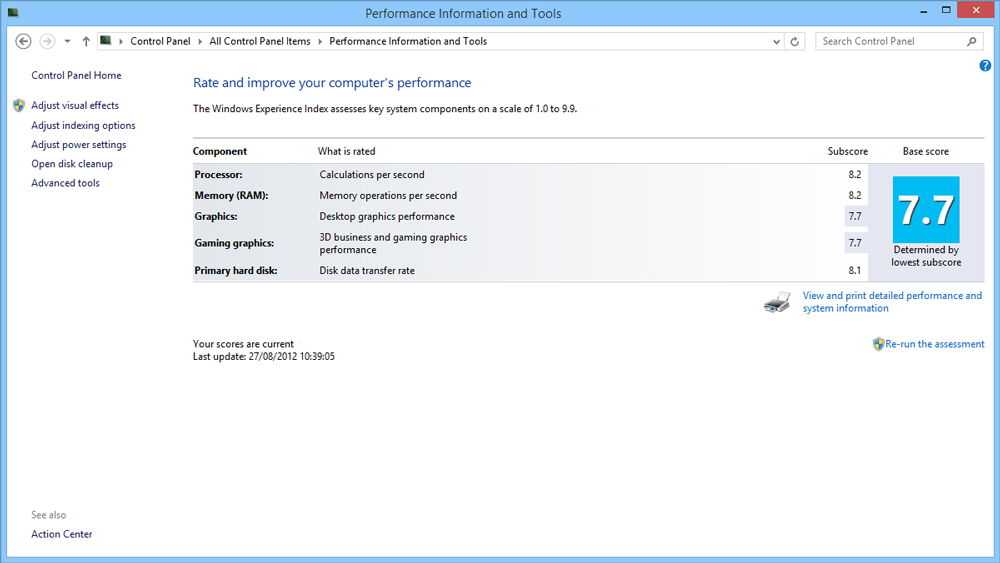 Опытные пользователи Windows помнят, что индекс оценки производительности (Windows Experience Index — WEI) впервые появился еще в Windows Vista. Индекс производительности рассчитывается на основании оценки производительности следующих подсистем компьютера: процессора, памяти, 2D графики, 3D графики и устройства хранения (жесткого диска). Для каждой из подсистем на основе результатов оценочного тестирования рассчитывается собственное значение индекса производительности, а общий индекс для всего компьютера (Base Score) равен минимальному значению среди всех подсистем.