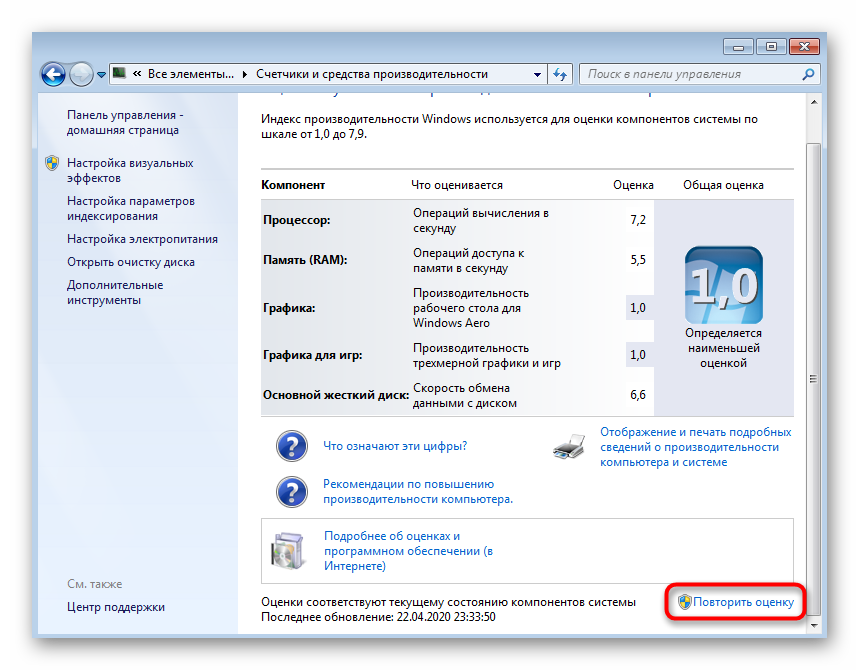Начнем с самого простого метода, связанного с решением проблем с работой индекса производительности в Windows 7. Вполне возможно, что именно при первом тестировании возникли какие-то ошибки, в результате чего результаты не удалось получить. Вам стоит самостоятельно запустить второе оценивание, проверив работоспособность функции.