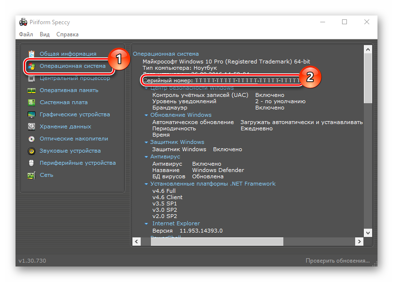 Для примера возьмем программу Speccy. В главном экране нажмите на кнопку Operating System (1). В правой части программы вы увидите Serial Number (2). Подобным способом можно найти серийный номер через другие вышеперечисленные программы.